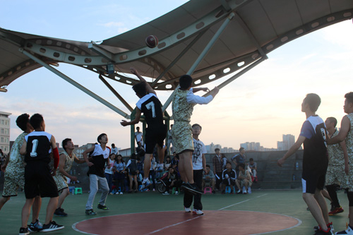 接下来的是环艺对阵“绘视数”。同学们仍然是热情高涨,助威呐喊声也给球员们带去了信心。由于女生队因事耽搁,所以首先开始的是男篮赛。比赛刚开始环艺班稍稍落后,但是他们并不气馁,而是积极寻找应对方法,更改队形,互相鼓励,很快便追了上来,并以几个完美进球赢来了一阵喝彩。而对手仍然实力十足,不骄不躁,保持了领先的势态。女篮赛事虽然推迟,但也不输男生的火热。每个人都是力量十足、信心百倍!随着时间的推移,夜幕降临,赛场上的球员们用自己快透支的身体坚持着比赛。摔倒、扭伤、碰撞……进球、犯规、擦框……一次次欢呼,一次次失落,啦啦队员们的目光紧紧追随着场上奔跑的球员。这场激烈的比赛以男篮21:44,女篮4:10(环艺Vs“绘视数”)而告终。