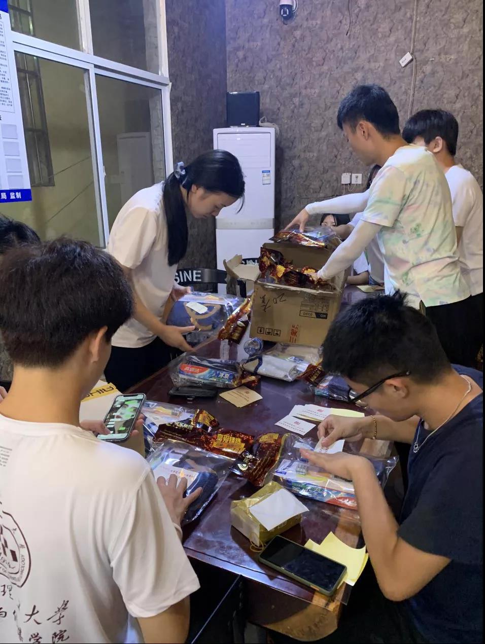 会后,团队成员对为村民们准备的物资进行了分类整理,并为每一份物资贴上了印有团队名称标志的贴纸。