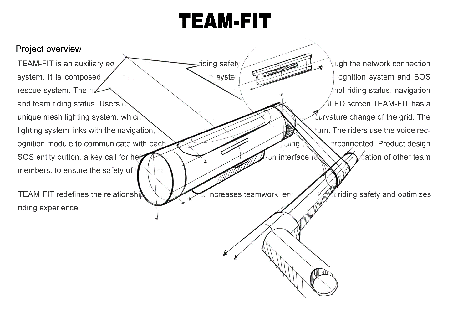 TEAM-FIT is an auxiliary equipment to increase the riding safety and team cooperation through the network connection system. It is composed of human-computer interaction system,lighting system,voice recognition system and SOS rescue system. The human-computer interaction interface integrates three modules: personal riding status,navigation and team riding status. Users can clearly observe their own speed and time through the OLED screen. TEAM-FIT has a unique mesh lighting system which can judge the road conditions ahead through the curvature change of the grid. The lighting system links with the navigation,and the projection mode reminds the riders to turn. The riders use the voice recognition module to communicate with each other,so as to keep the whole cycling team interconnected. Product design SOS entity button, a key call for help, though human-computer interaction interface real-time notification of other team members, to ensure the safe of team members.