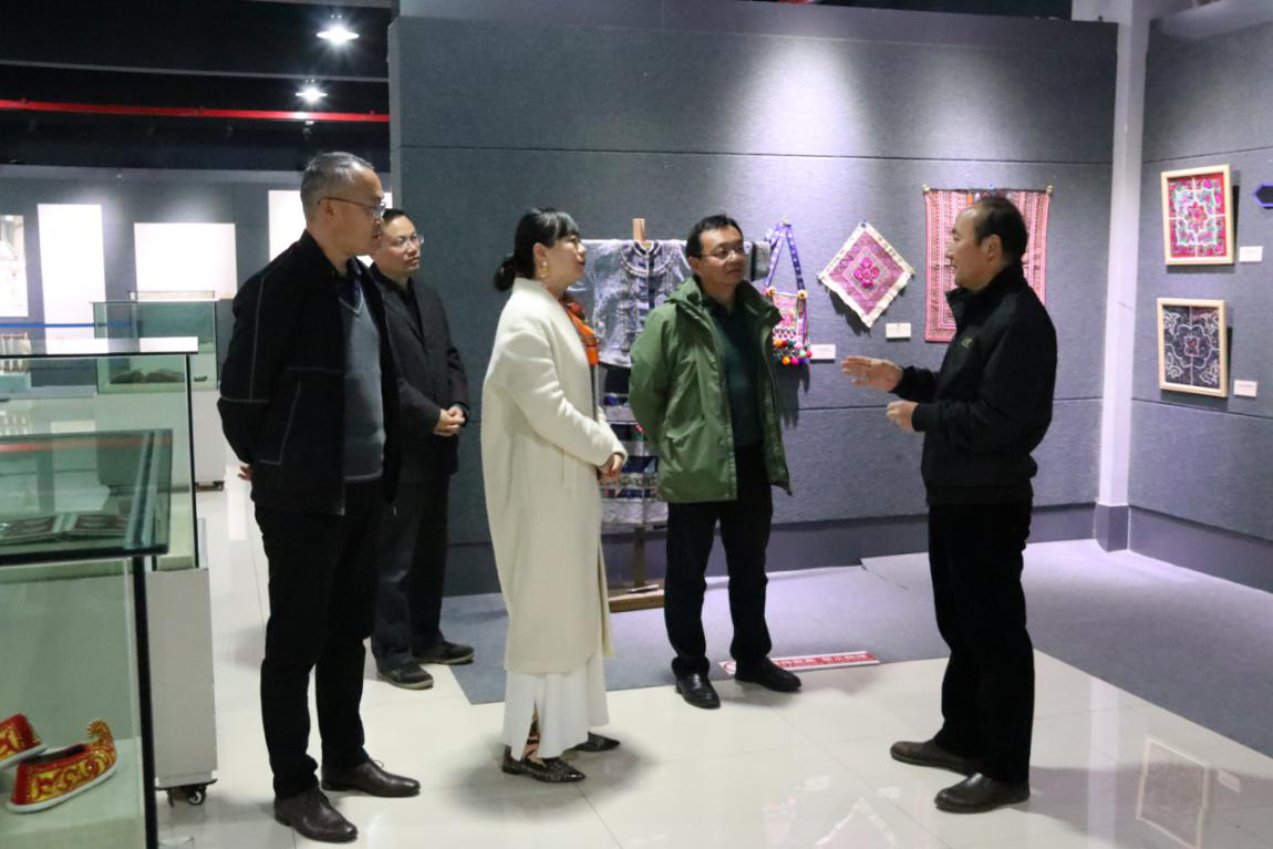 党委书记孙刚、院长许佳、副院长张建国和副院长王勇的陪同下先后参观了纵横经纬的艺术·云南民族民间织、染、剪、绣精品展和云岭正当国潮时·云南民族文化创意产品设计展。