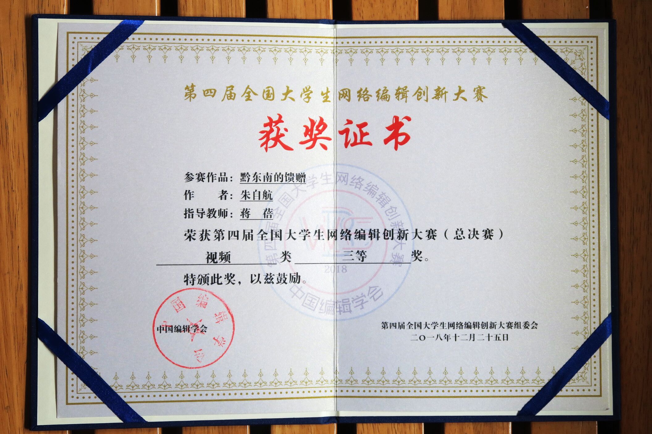 新闻传播系多名师生获奖。其中,朱自航同学作品《黔东南的馈赠》荣获全国总决赛视频类三等奖暨西南赛区视频类三等奖,王九燕、保德英、延杰婷、程成、佘明泽、赵富来、谢佩倪、甘祖飞等47位同学的24件作品,分获西南赛区网页类、程序类、音频类优秀奖,蒋蓓老师获“优秀指导教师”称号。