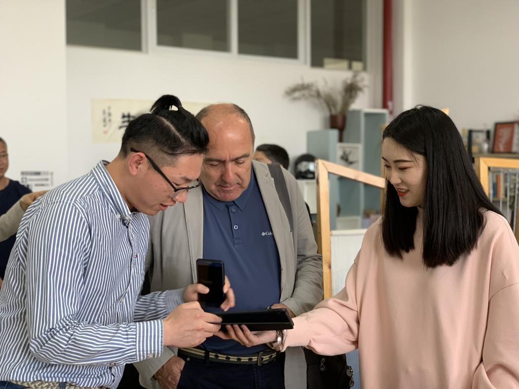 图3 Francesso Savonitto先生在听取非物质文化遗产乌铜走银学生设计作品的介绍