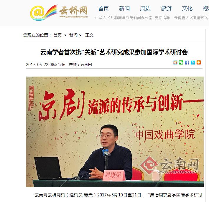 周康梁教授应邀到北京参加”第七届京剧学国际学术研讨会”,在会上作《“关派”艺术传承和研究现状》的主题发言。5月22日,云南网发布长篇报道,题为《云南学者首次携“关派”艺术研究成果参加国际学术研讨会》,对周康梁教授参加此次国际学术研讨会情况进行了详细报道,称这是云南“关(肃霜)派”艺术第一次以完整的学术成果形式出现在全国京剧理论研究研讨会上。