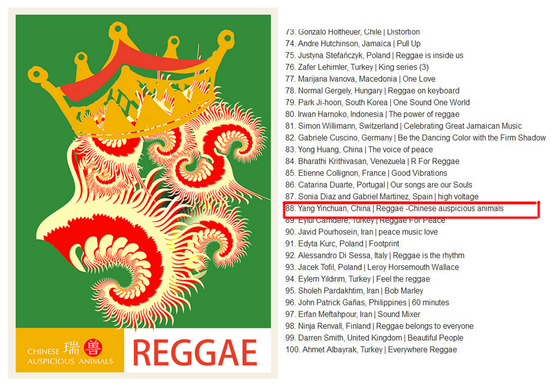 杨吟川老师的作品《Reggae-Chinese auspicious animals》在这次比赛中入围前100名,成为2016年竞赛的获胜者。
