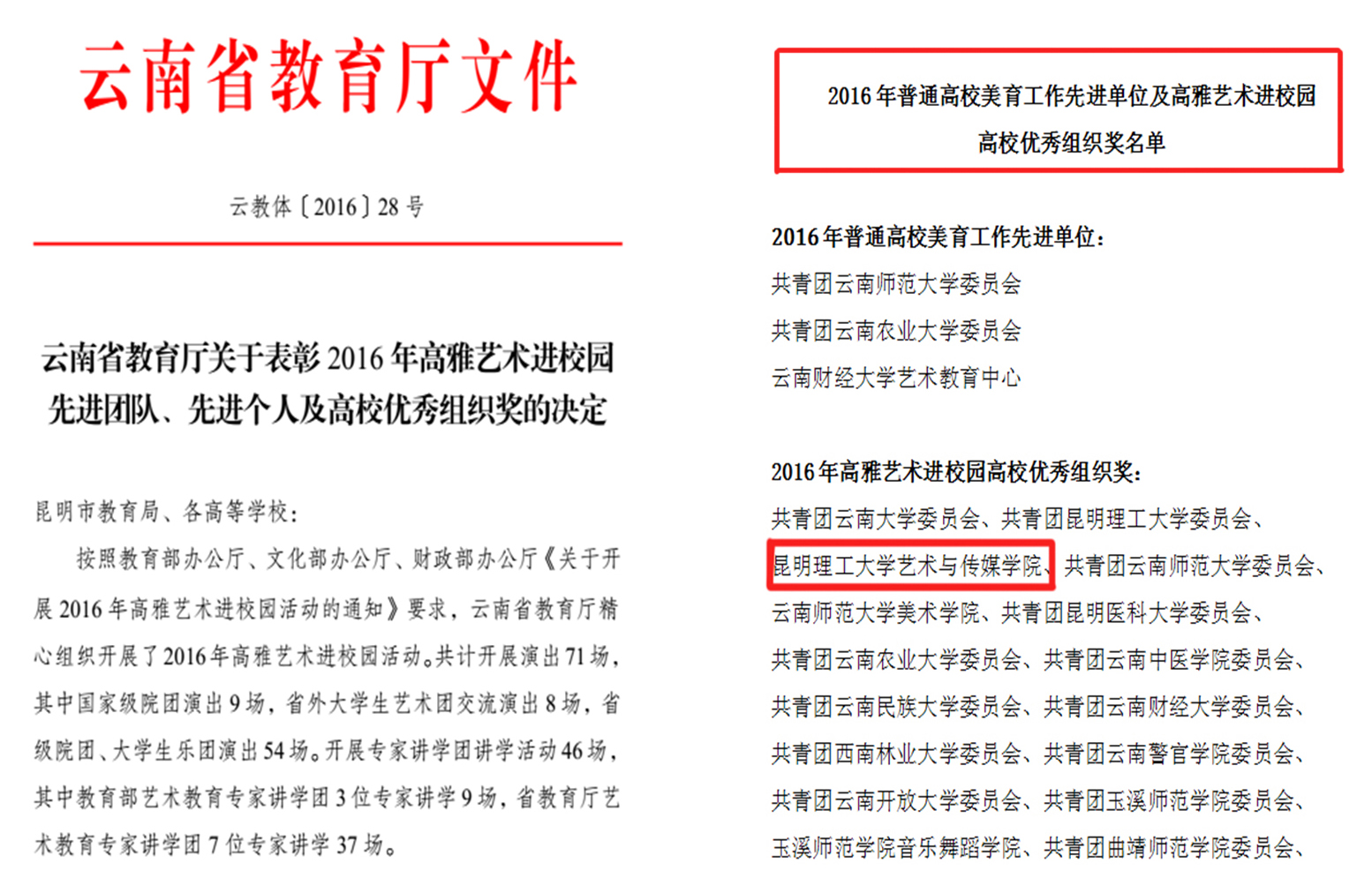 在2016年底,云南省教育厅发布了云教体28号文件,表彰了2016年高雅艺术进校园的一批先进团队、先进个人及高校优秀组织单位,21点技巧 荣获“2016年高雅艺术进校园高校优秀组织奖”。