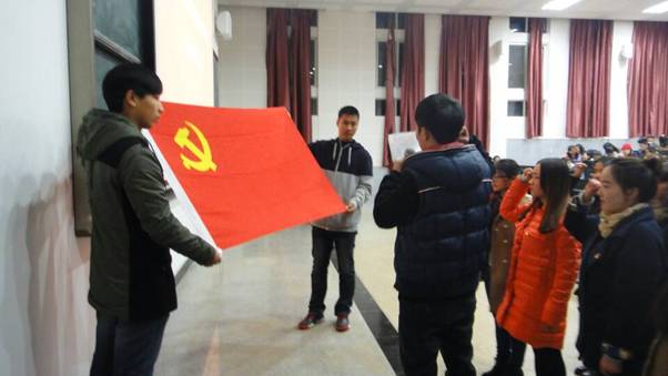 随后进行的是大会的第三项议程,新党员入党宣誓仪式。新加入中国共产党的党员们庄严的站在党旗下宣誓,决心要为共产主义事业奉献自己的全部,在临近期末的关键时期一定会发挥党员模范作用,带头诚信考试,以身作则、诚实做人。