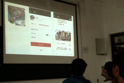 (幕帘上正在展示的,是由王小莉、何开萍、龙珊、万世明等同学所设计的微信公共账号——单色。)