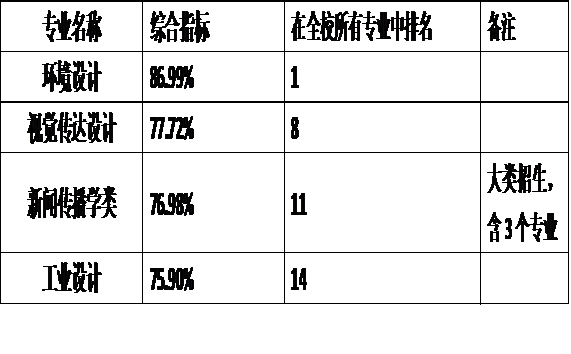 环境设计专业以86.99%位列全校所有专业的第1名;视觉传达设计以77.72%,位列全校第8名;新闻传播类以76.98%,列全校第11名;工业设计以75.90%,列全校第14名。21点技巧