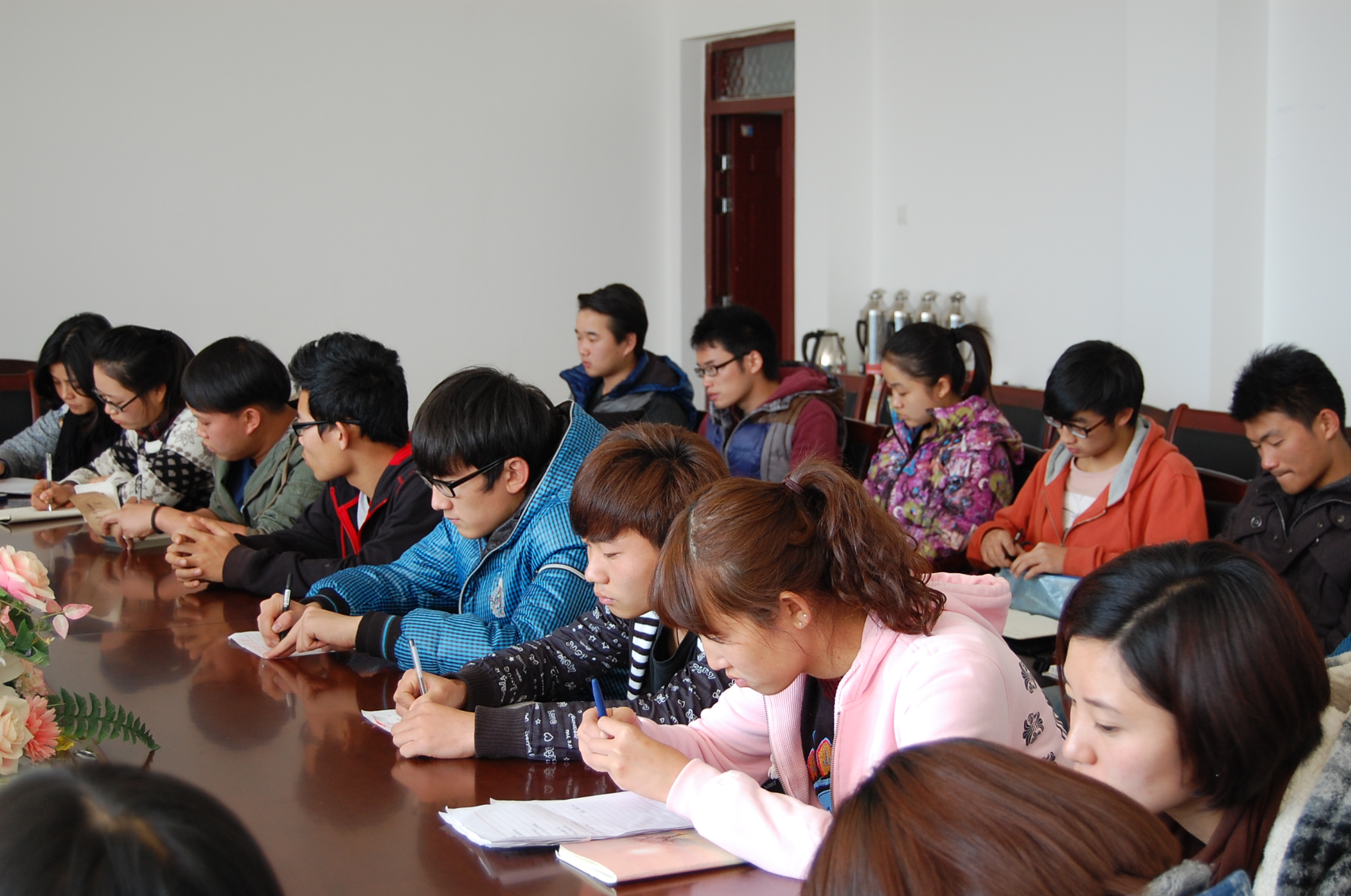 2013年 12月5日下午,学院在会议室召开了有关教学方面的学生代表座谈会,许佳、苏峰、王勇等院领导、学院教务办负责人和各班代表参加了座谈会。