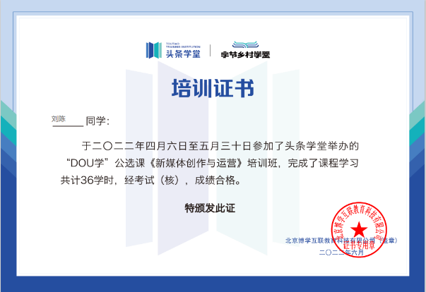 2019级广告班的同学成功通过课程学习、实操演练及考试考核,共计33名同学考试合格,并获得头条学堂颁发的电子结业证书。参与此次培训的12080名同学中有33名同学脱颖而出获得闪光学生称号,其中,21点技巧