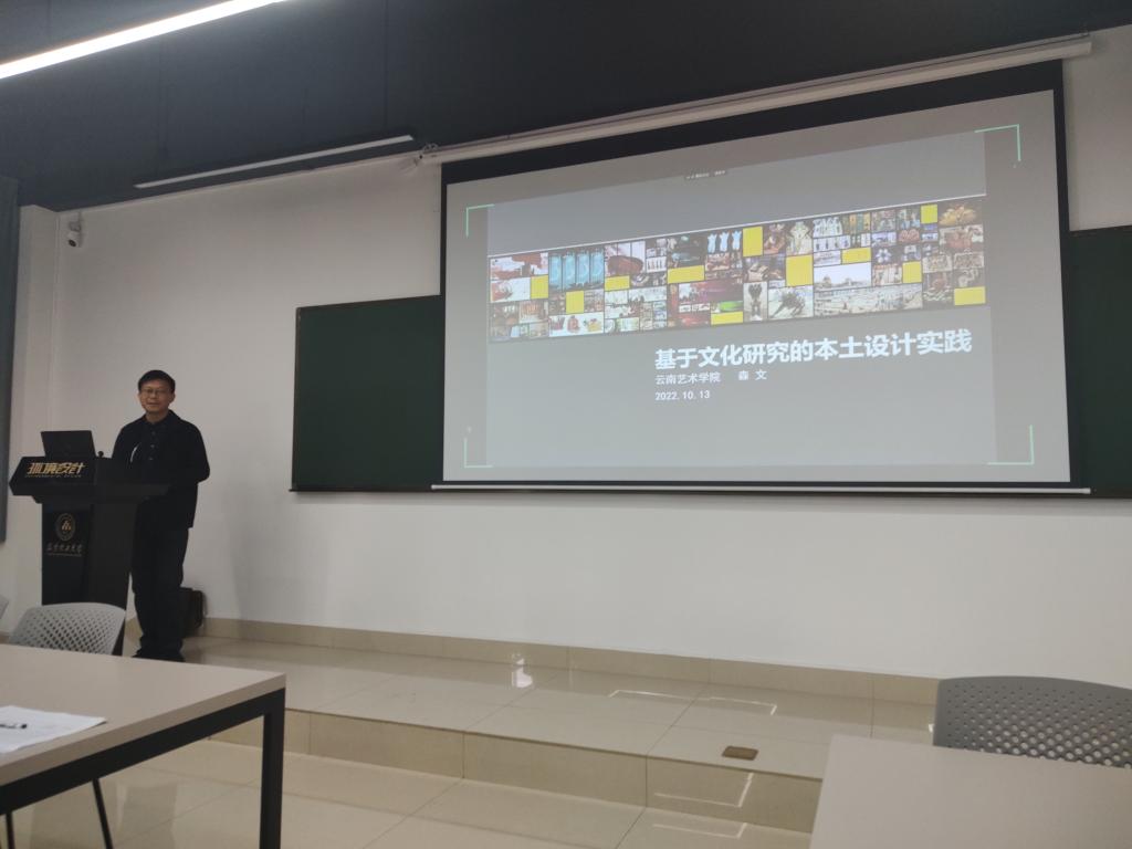 此次论文工作坊由云南艺术学院森文教授分享“基于文化研究的本土设计实践”。森文老师讲述了对设计学科相关的关系、界定、认识、观点;介绍分享了自己的实践项目、学术成果和科研经验;与在座的老师和同学针对学术问题做了很多深入的探讨和交流。