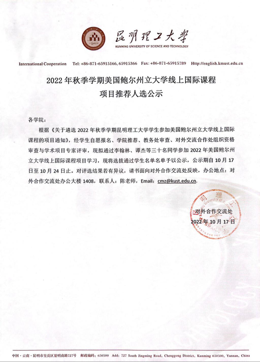 经过报名、预选与面试考核,现拟通过李翰林、谭杰等三十名同学参加2022年美国鲍尔州立大学线上国际课程项目学习。同时,以上同学将自动入选21点技巧