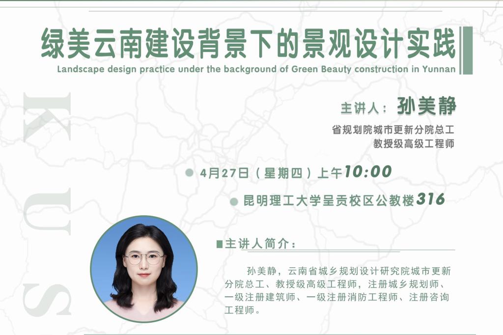 邀请云南省城乡规划设计研究院城市更新分院总工孙美静老师为大家做了题为《绿美云南建设背景下的景观设计实践》的学术报告,学院师生及相关领域专家学者近百人参加了此次活动。