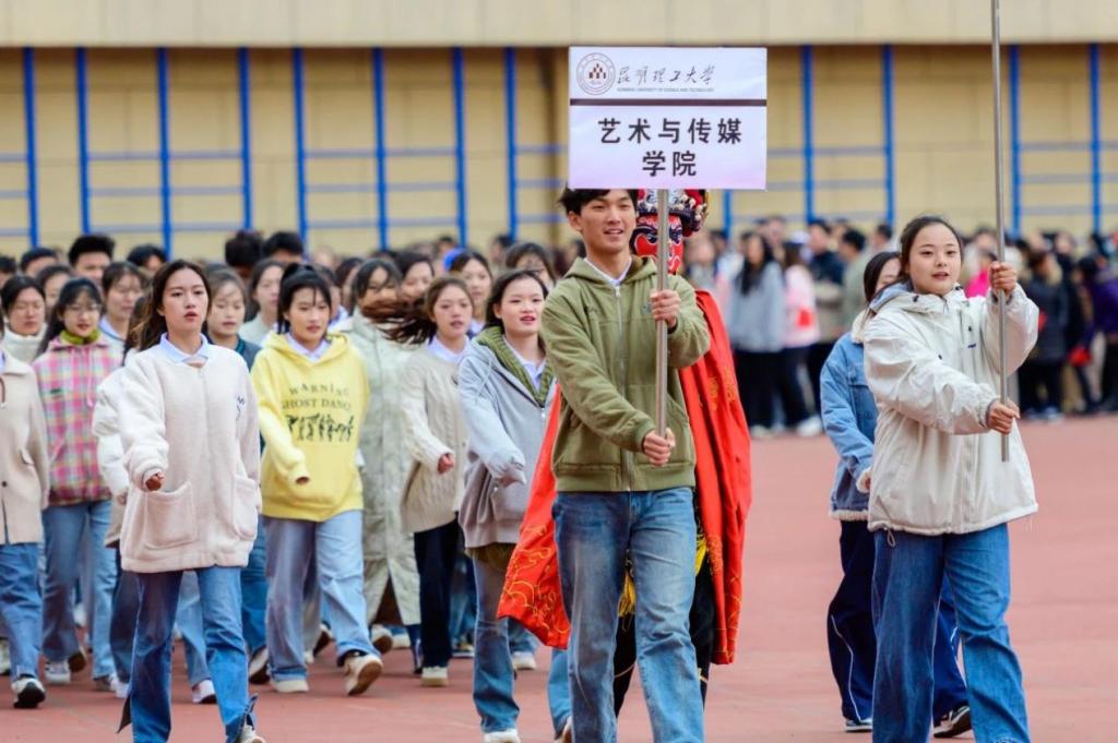 由艺传院学生和教师组成的方阵队伍不畏寒冷,踏着铿锵有力的步伐,喊着响亮的口号走向检阅台,向全校师生展现着艺传院师生的青春力量。