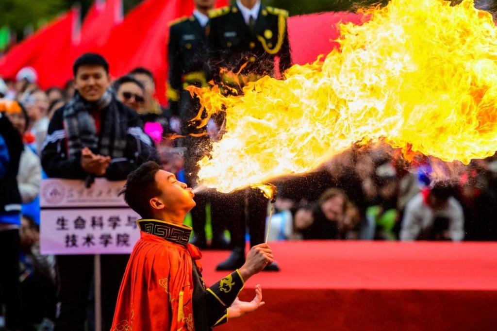 艺传院方阵的席鸿武同学表演了川剧变脸及喷火特技。川剧是传统戏曲剧种之一,川剧变脸是川剧表演的特技之一,川剧变脸是运用在川剧艺术中塑造人物的一种特技。喷火也称吹火,秦腔绝技,表演者可以从嘴中喷出火来,其重要性有如变脸之于川剧。